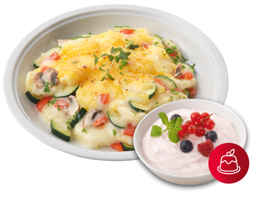 Gloria® bringt Ihnen Ihr leckeres, heißes Mittagessen auf Wunsch auch auf einem runden, steglosen Porzellanteller. Mühseliges Umfüllen auf eigenes Geschirr ist nicht mehr notwendig, Sie können direkt stilvoll genießen.
